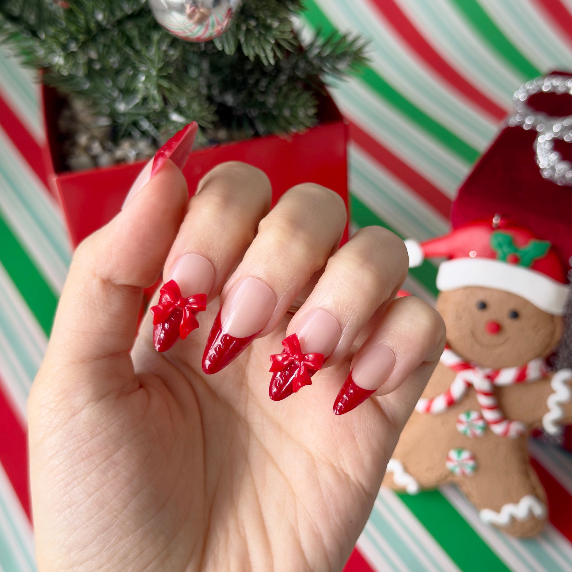 Berry Kiss serves cherry-red glam with a festive twist. A soft nude base melts into glossy berry-red tips. Finished with a 3D bow accent wrapping your fingertips like a gift. It's bold, shiny and feminine.