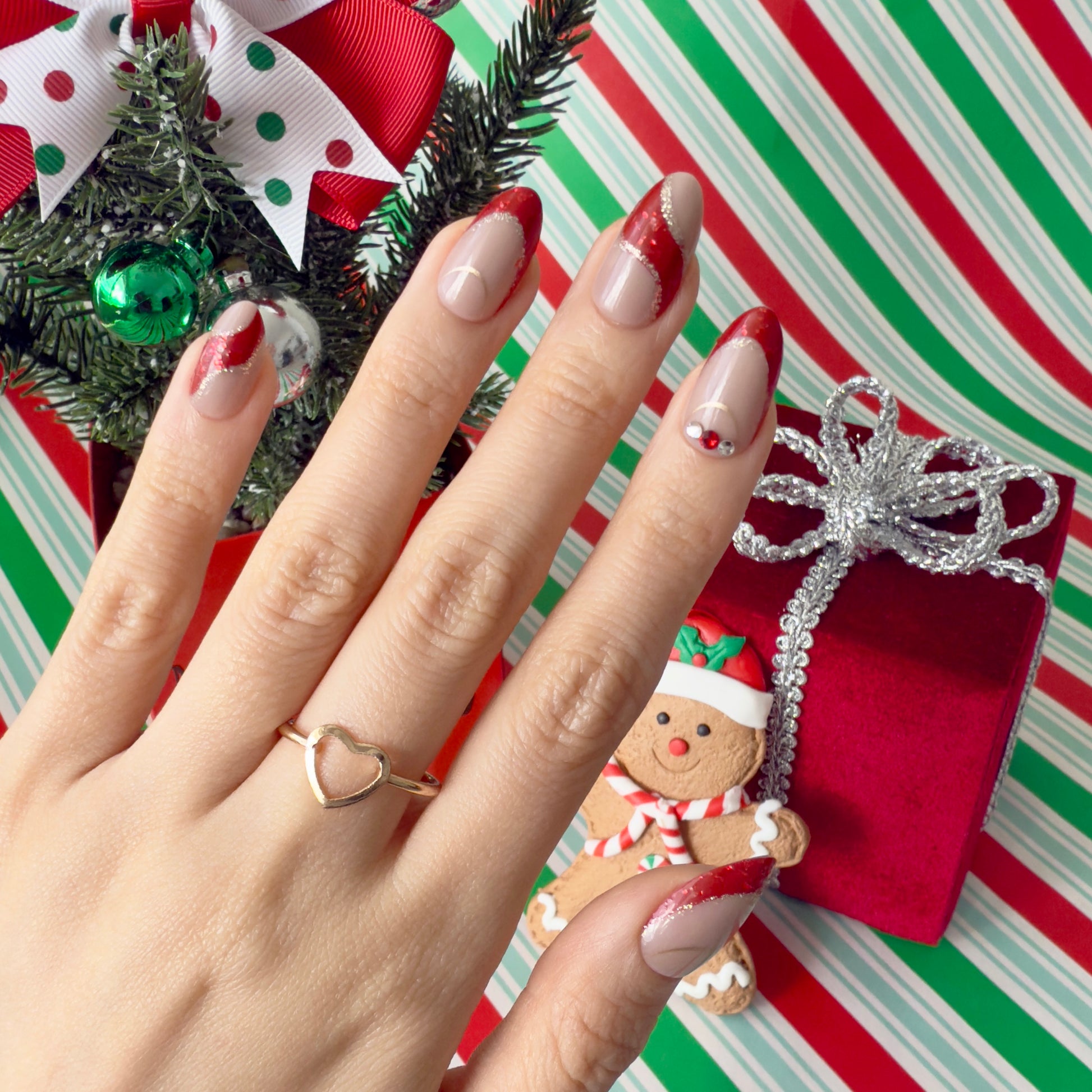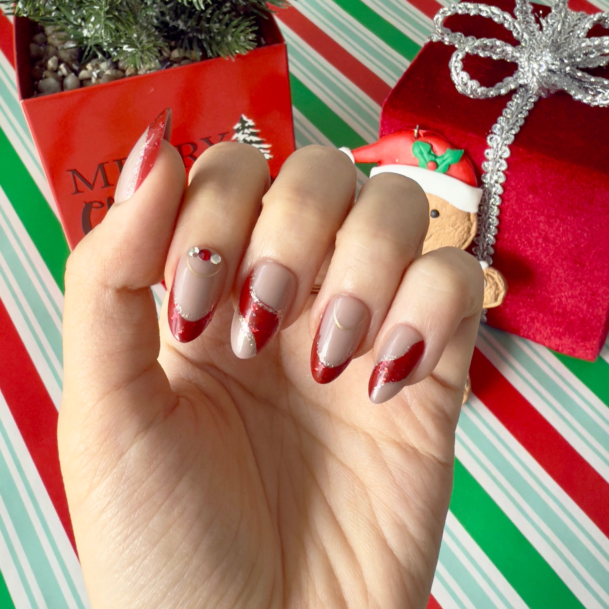 Crimson elegance, soft, sophisticated, and perfectly festive, this set pairs a nude base with rich red accents, shimmering red and gold glitter details, and tiny crystal jewels for a subtle touch of sparkle. The curved tips and fine metallic lines give a chic, gift-wrapped look that’s elegant without trying.