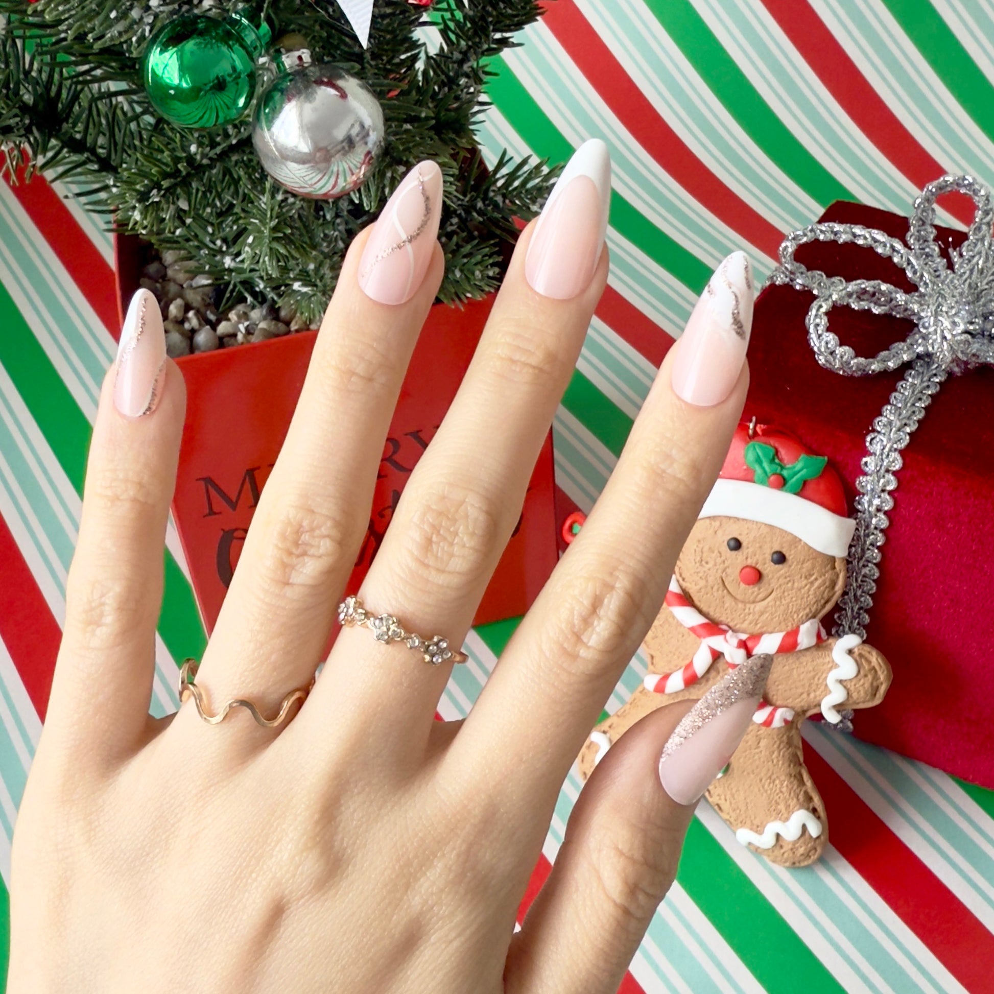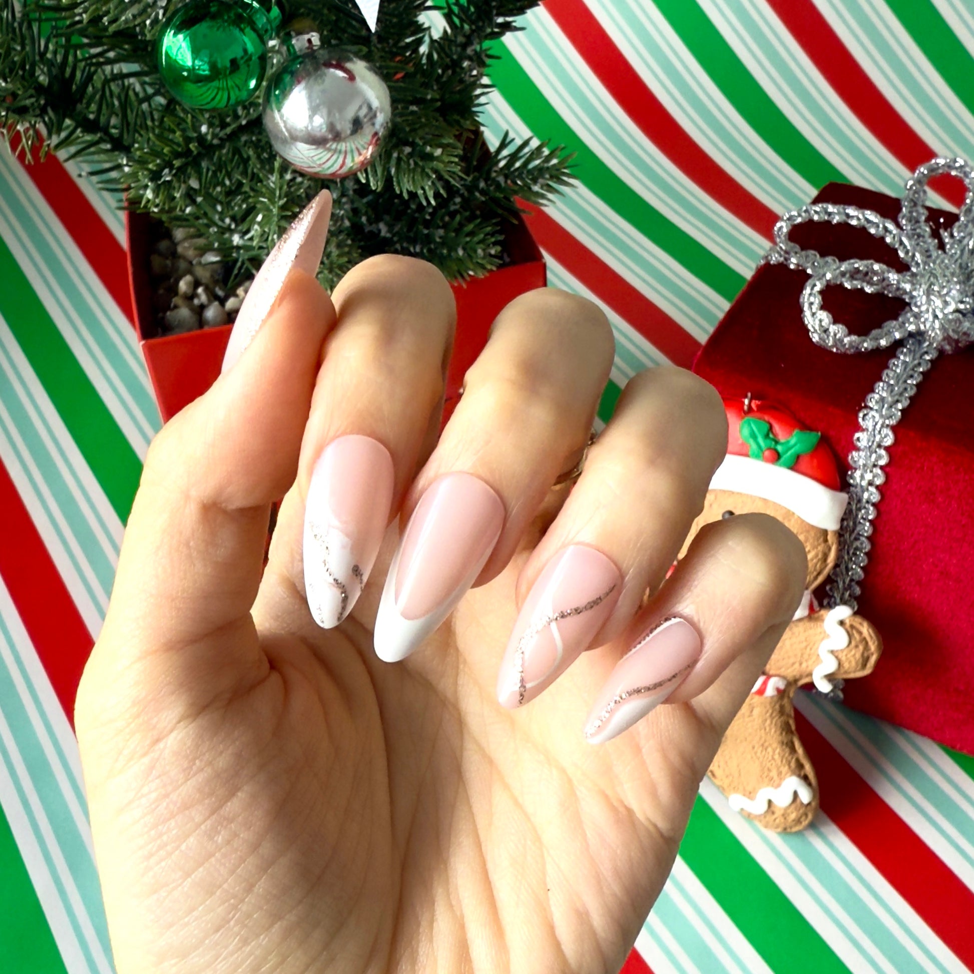 Rose Gold Veil is a soft pink nude manicure with a dreamy twist. Sleek white tips and delicate rose gold glitter lines that swirl across each nail like a shimmering veil. The glossy finish and almond shape give a chic, elongating effect that flatters every hand.