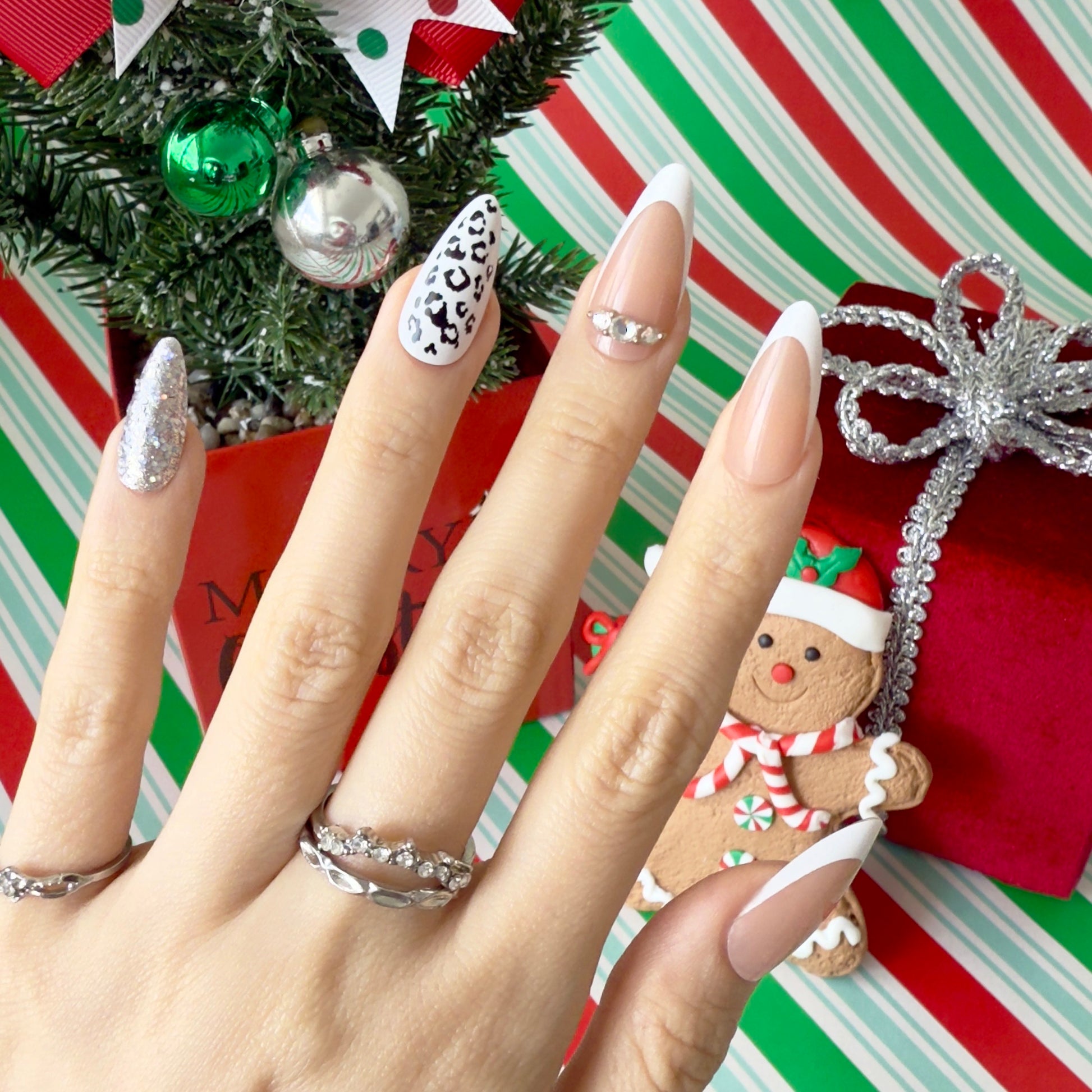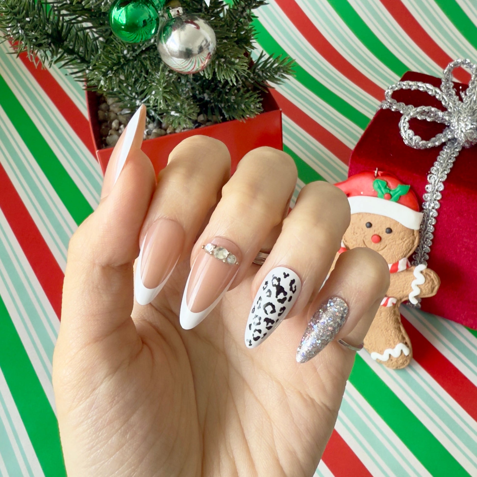 Wild Glamour mixes classic French tips with a fierce twist: a glossy nude base, crisp white tips, a silver glitter accent nail, and a chic black and white leopard print. A row of sparkling crystals adds extra glam, catching the light with every move.